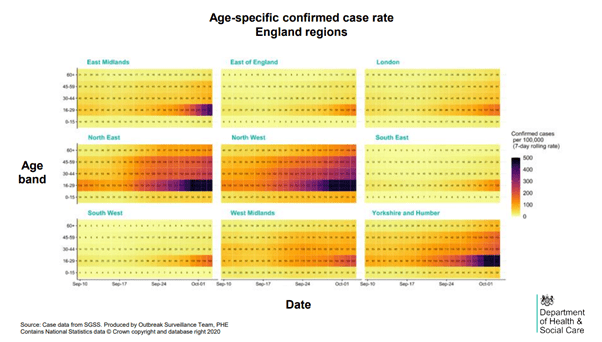 The second is the demographic factor: over summer younger people have been contracting the virus at a high rate. They have a habit of not getting particularly ill. As a critical mass of young people harbour a reservoir of Covid, the disease starts to slip through age demographics as shown in an age breakdown of cases. As the cases start to get to older people, we have begun to see the corresponding uptick in hospitalisation.