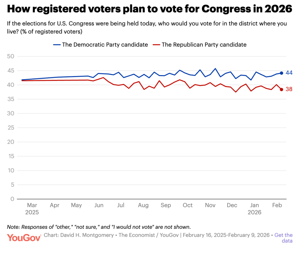 Spurious claims of electoral fraud, politicisation of key governmental functions (like the FBI, for instance), and myriad other forms of fuckery have begun to stoke fears that El Presidente’s personal militia might end up intimidating and harassing people on their way to the polls in coming months. Vox published an article entitled: “Trump has a plan to steal the midterms. It will probably fail”. The US will go to the polls in November, as of February 2026 YouGov reckon the Democrats have the edge.